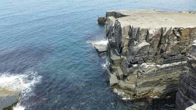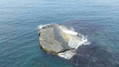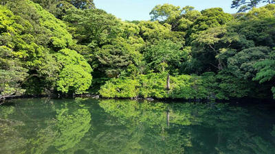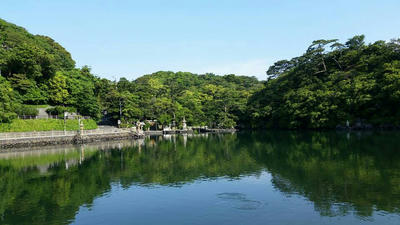 明神池、岩の隙間から海とつながっており、鯛やふぐ、アカエイなど多種の魚が泳いでおり、さながら自然の水族館です。