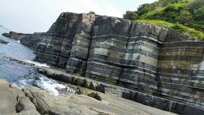 結構な勾配がいくつか続いた先に、本日の主役、須佐ホルンフェルスが目の前に現れました。遠くから見ると、あれっ、大したことないぞという感じですが………(~_~;)