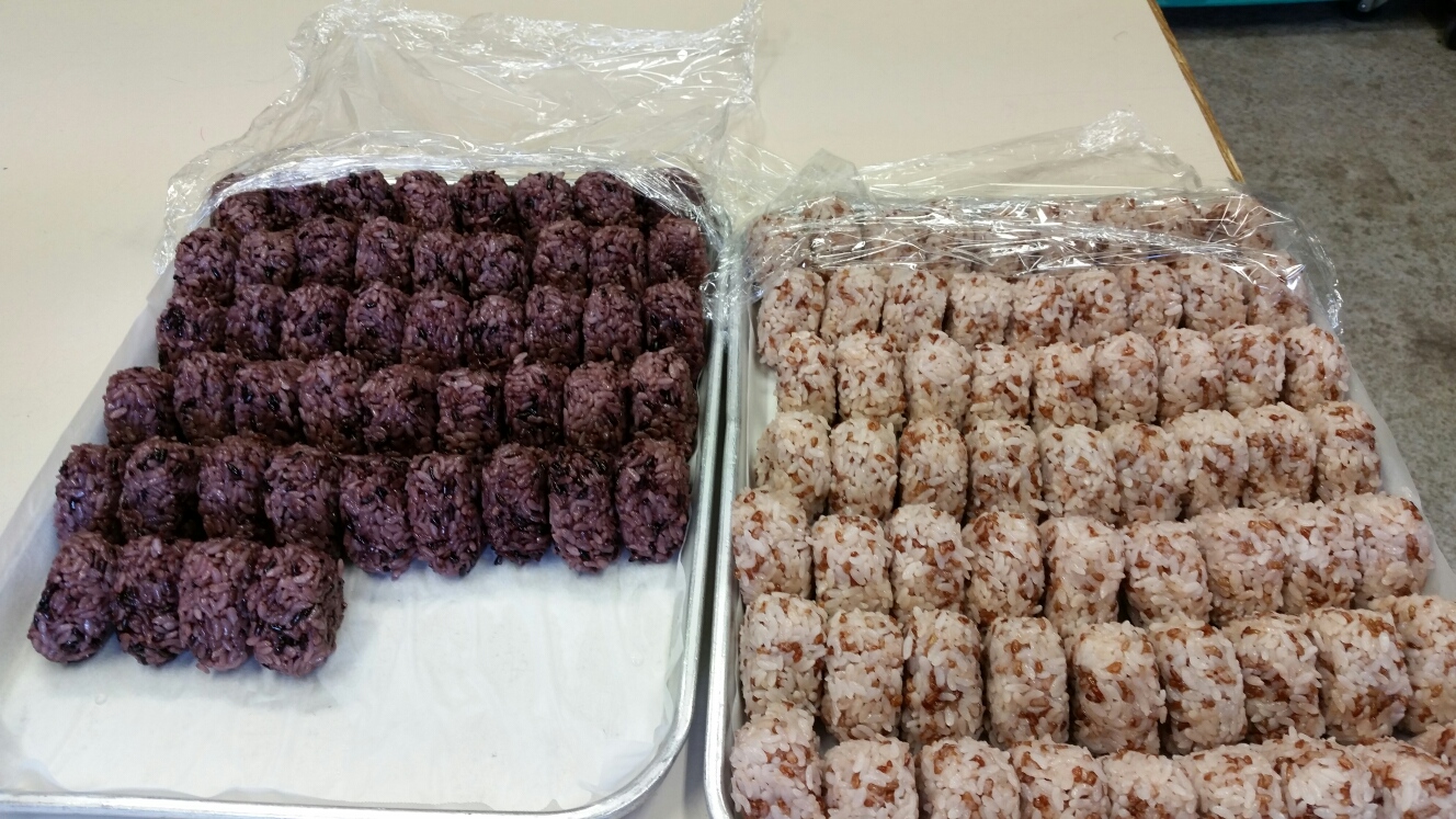 黒米と赤米の入った二種類のおにぎりを試食