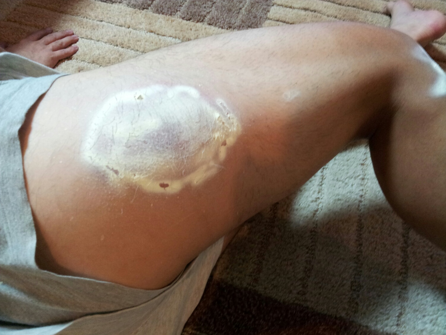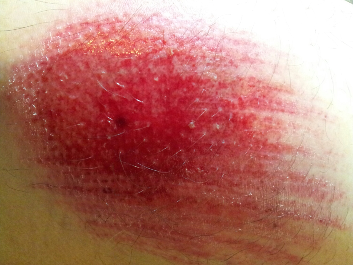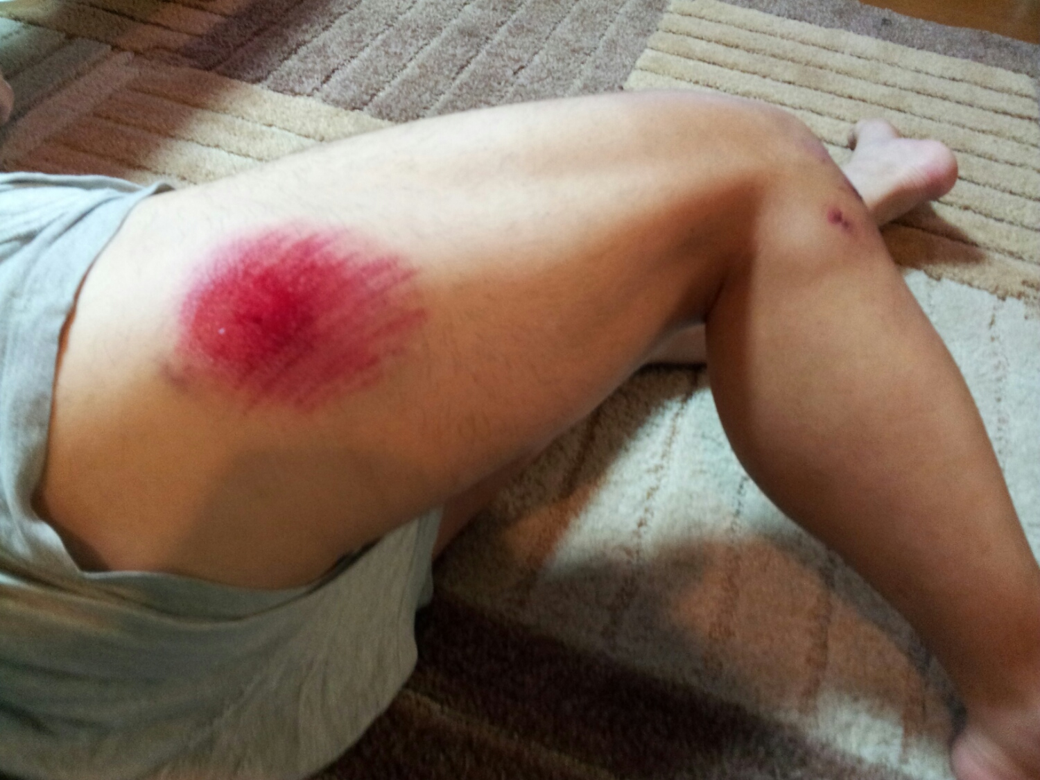 サイクリング中の落車で、右足大腿部外側に、打撲と擦り傷を作ってしまった。