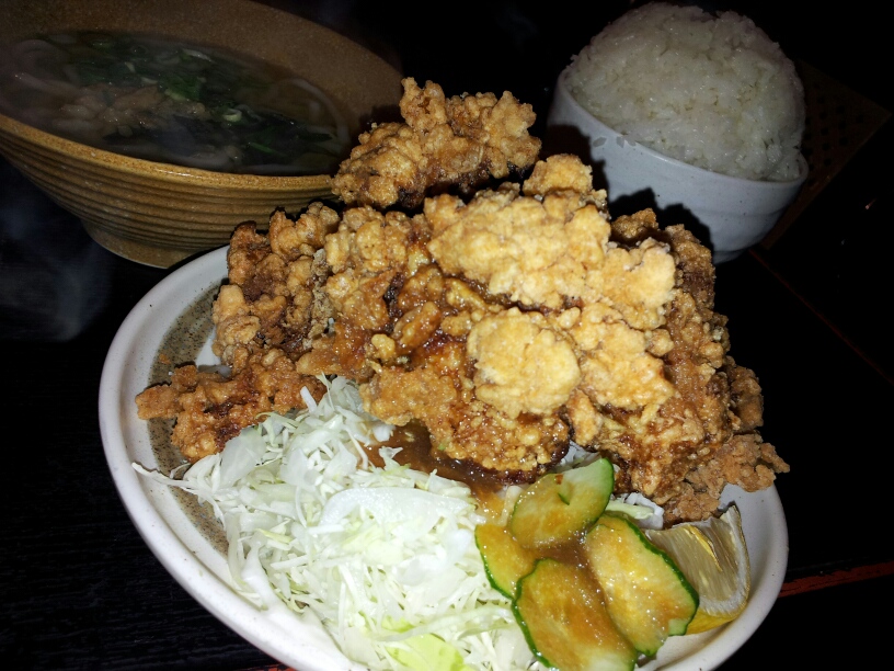 夜は、前から気になっていた”大和屋”へ初めて行きました、学生に人気の定食屋です。店前には、物凄い数の自転車が・・、店内も超満員!!まだ、6時前なのに・・注文は、唐揚げ定食、大盛りが50円増なので、迷わず大盛りで・・