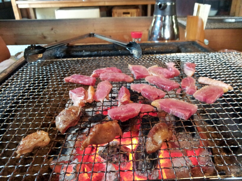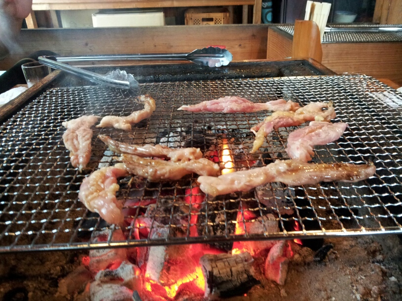 加え、イノシシのもも肉を焼きます。