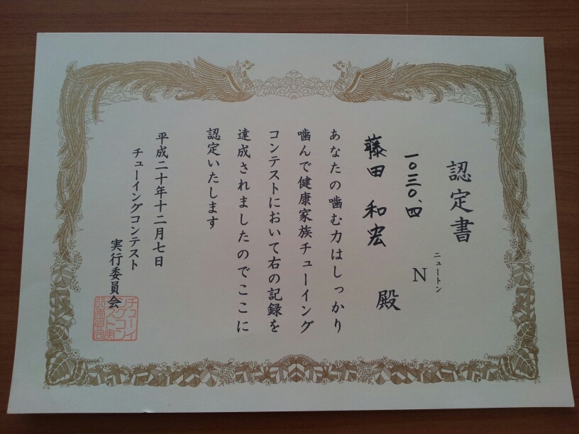 4年前デンタルプレスケールという、咬合力測定器による噛む力コンテストで準優勝した時の認定証です。
