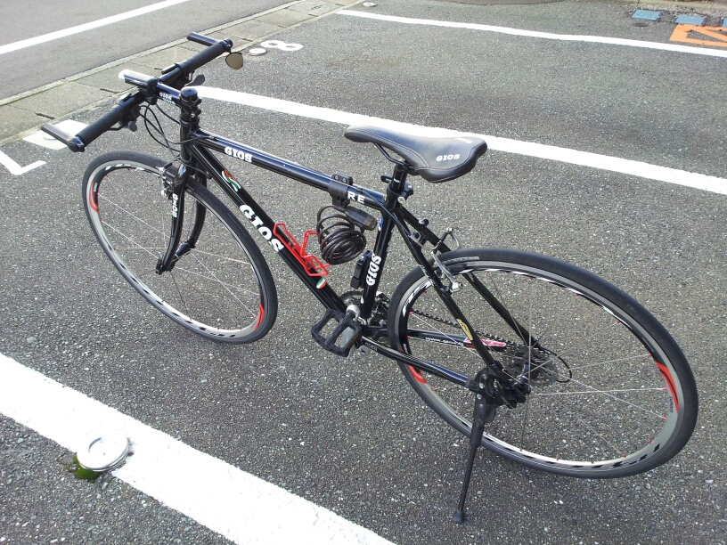 高校時代は、片道7㌔をBSのユーラシア ツーリングで通学していましたが、その後、原動機付乗り物に興味が移り、自転車とは無縁の怠惰な生活に溺れていました。ガソリンの高騰と自身のダイエットのために、一大決心して自転車通勤を始めたのが5年前。最初は、MTBルック車に乗っていましたが、半年くらいでスポーツ自転車が欲しくなり買ったのが、ジオスのクロスバイクです。現在も通勤(片道11㌔)のお供に大活躍。ジオスブルーではなく、あえてブラックを選び、チョイ悪感を出してます。ホイールは、シマノのRS30というセミディープに替えてます。そう言えば、コイツでよく九千部山に登っていました。ロードを買ってからは、全然山に行っていません。久々に登ってみるか……